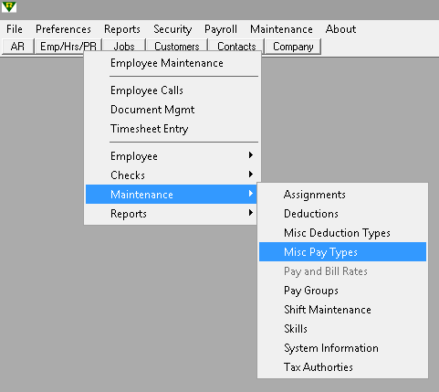 Click on the EMP/Hrs/Payroll button, click on Maintenance and choose Misc Pay Types from the fly out menu.